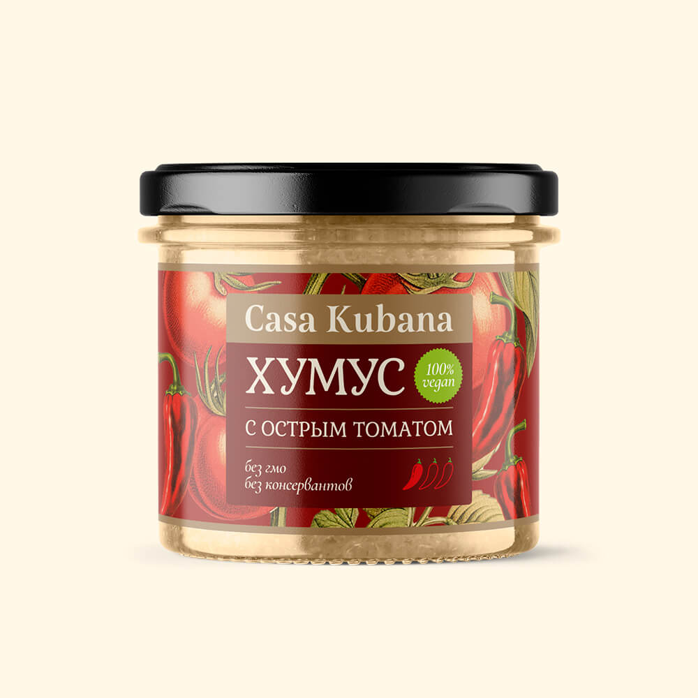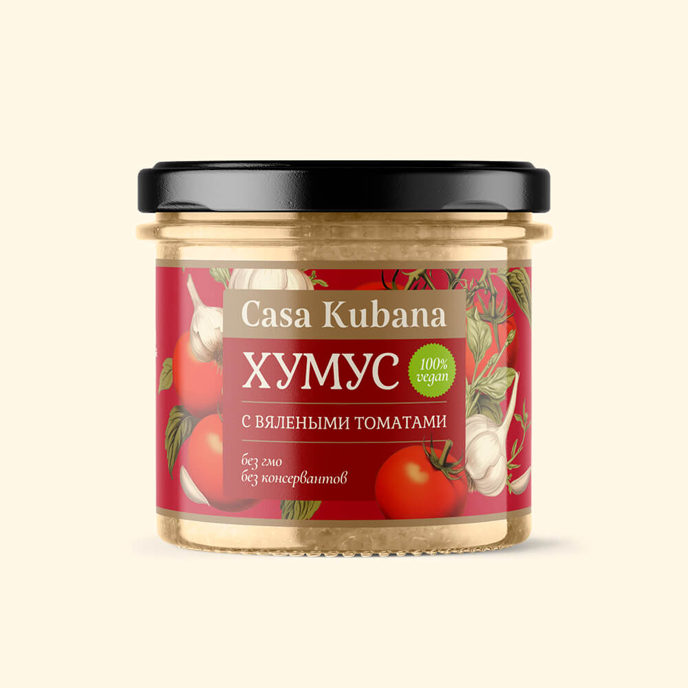 Нут, вода питьевая, масло подсолнечное рафинированное дезодорированное, тахини (кунжутная паста), паста томатная, сушеный томат, экстракт дрожжевой, соль морская пищевая, чеснок сушёный, загуститель (камедь гуаровая), перец красный острый хлопья.